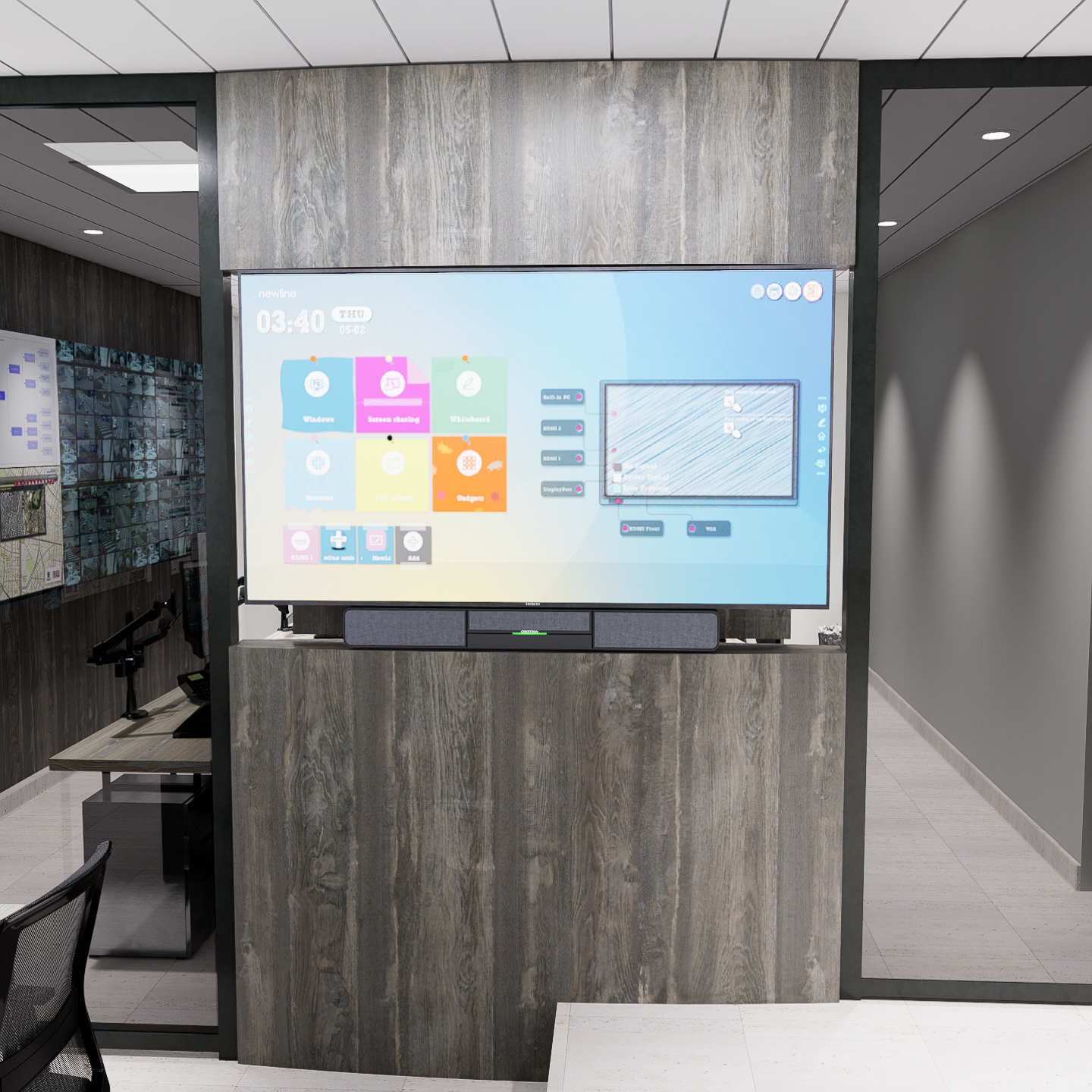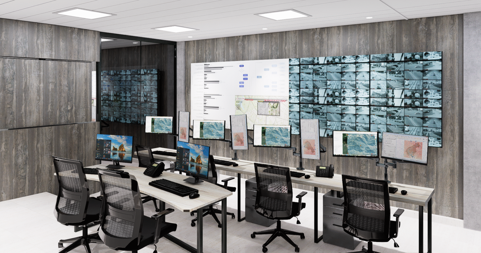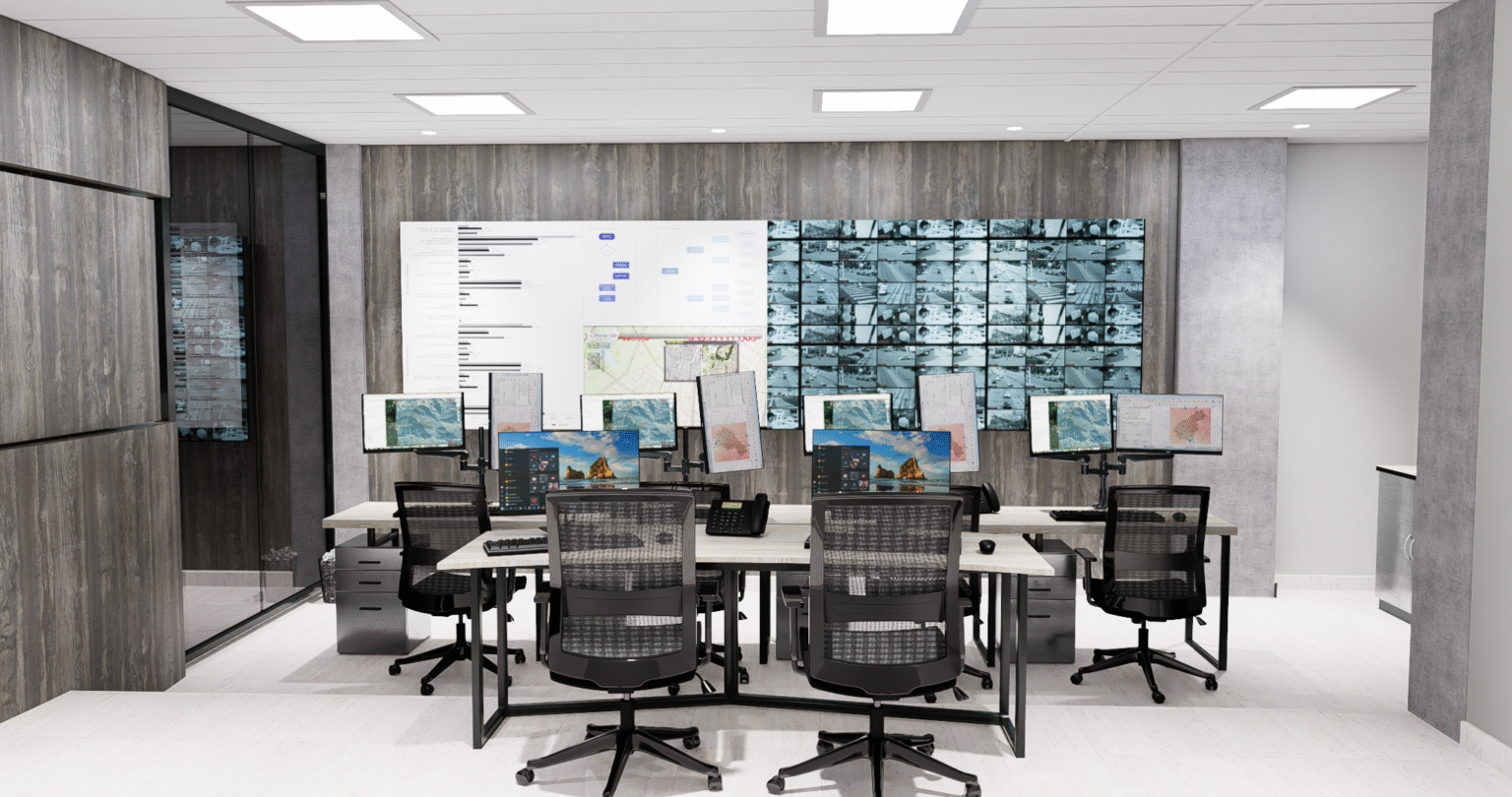 Se desarrolló una propuesta arquitectónica y de mobiliario que integra videowalls y pantallas divididas, optimizando el monitoreo simultáneo de múltiples fuentes. Los muebles ergonómicos y modulares fueron diseñados para maximizar la eficiencia y el confort de los operadores, mientras que la iluminación estratégica y la paleta de colores neutros y modernos refuerzan la concentración y el rendimiento del equipo.